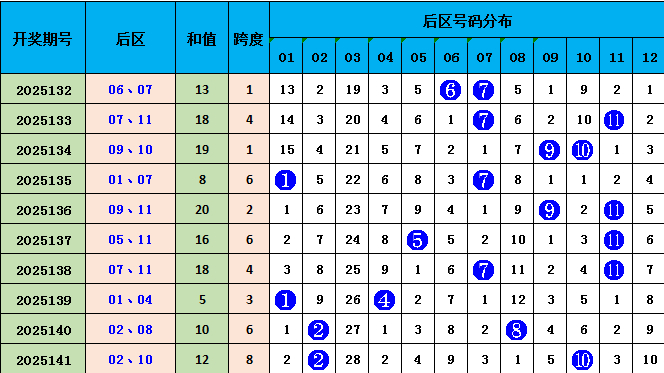 上期后区开出号码02、10,和值12,最近十期,和值开出范围在5--20之间,波动较大。本期预测和值较上一期上升,精选一注后区和值17,推荐05、12。