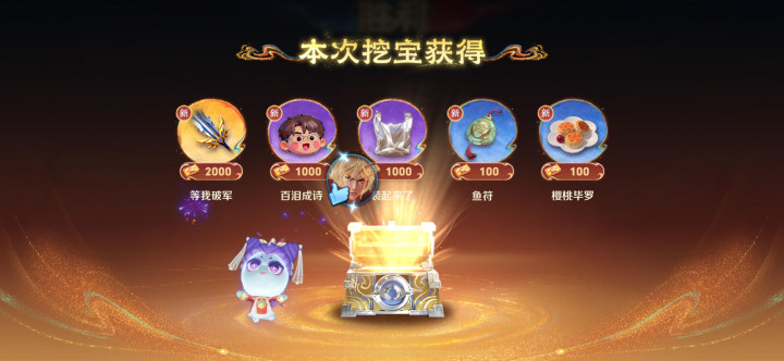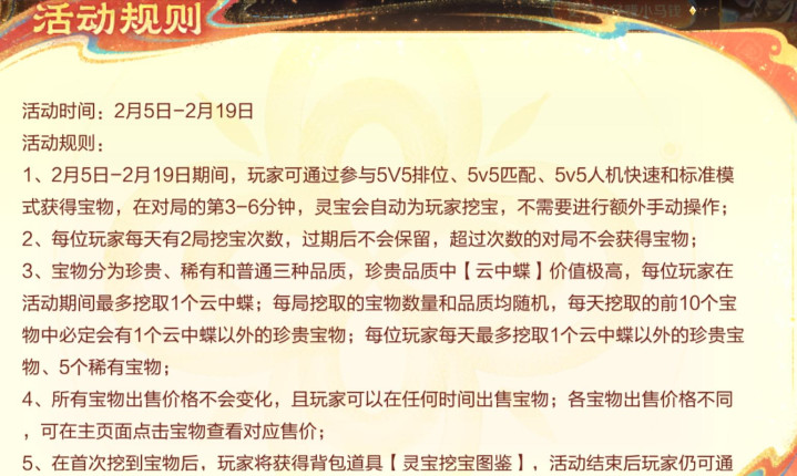 (3)灵宝挖宝可以通过排位、匹配、人机快速对局的方式获取宝物,每次只能挖2局10个宝物,3~6分钟时候会自动挖满。