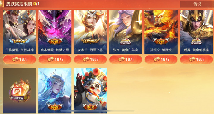 由于本次的规则为皮肤奖池只有一次购买机会,所以不推荐道具及传说以外的皮肤,价格均为18万。