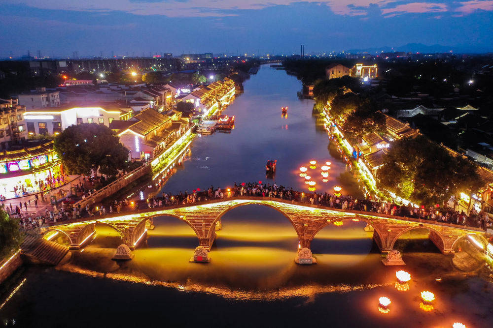 r10月2日,游客在塘栖古镇的广济桥观赏运河夜景(无人机照片)。 新华社记者 徐昱 摄