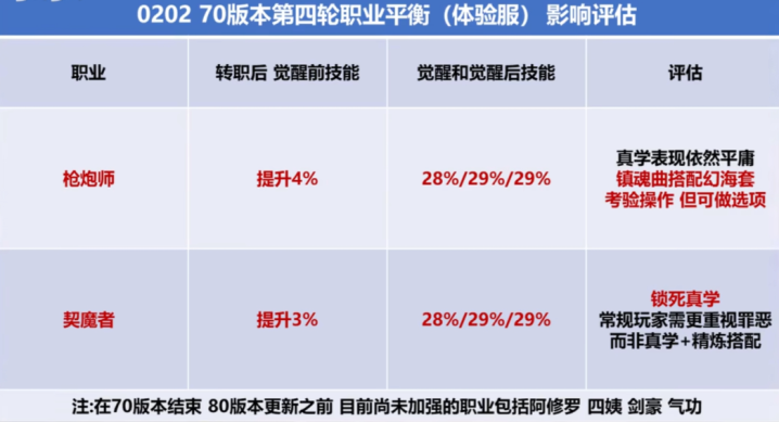 而这次70版本第四轮加强的这2个职业相对来说还是很冷门的,但即使是冷门职业这次也是获得了大加强,觉醒后技能伤害最高+29%,这一波加强也是让枪炮师和契魔者爬出下水道成为新的T0职业了啊。而还有转职书的玩家也是恭喜了,直接变成T0转职书,转职这两职业后伤害能+29%。值得注意的是,这几轮加强中只有四个职业没有被加强过,分别是阿修罗,四姨,剑豪和气功。不过大家也别担心,这几个职业后期估计也是会被大加强的。