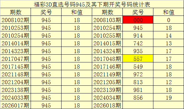一、开奖回顾:第2026017期福彩3D奖号为945。奖号奇偶比为2:1,和值为:18,跨度为:5。