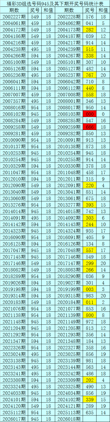 二、组选分析:历史上组选号码945开出了63次,其下期奖号分别为:576-041-282-039-914-515-338-307-482-767-710-440-558-346-950-000-547-666-850-913-873-945-914-378-458-315-220-851-675-393-742-303-244-935-405-134-557-549-299-266-036-301-003-983-011-853-800-972-813-356-184-358-856-981-563-486-202-490-856-339-289-635,其开出期数和下期奖号统计为: